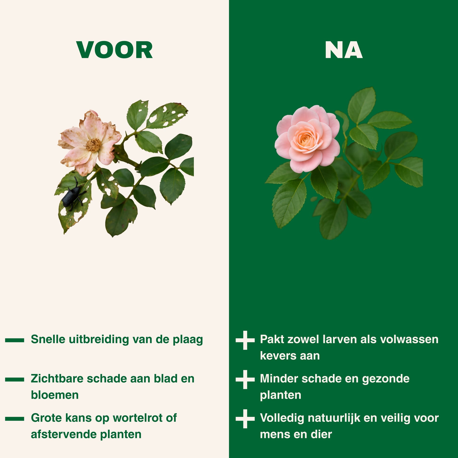 Binnen een paar dagen zie je resultaat. De volwassen kevers sterven na besmetting en de bladschade neemt af.