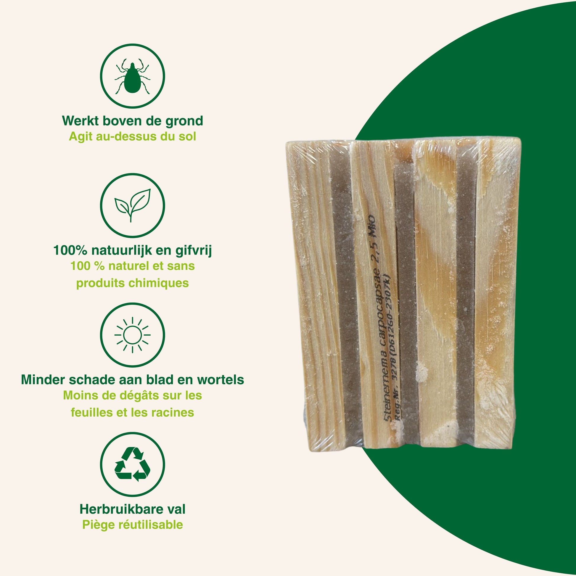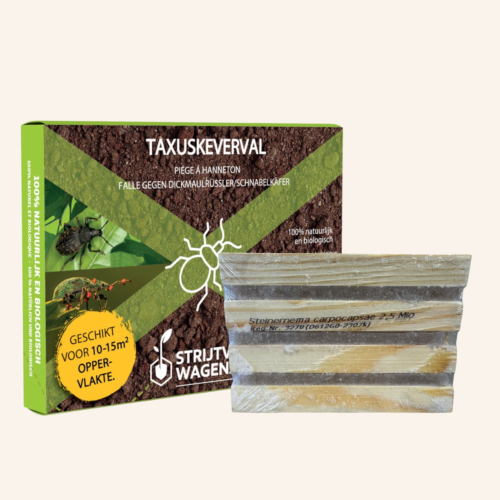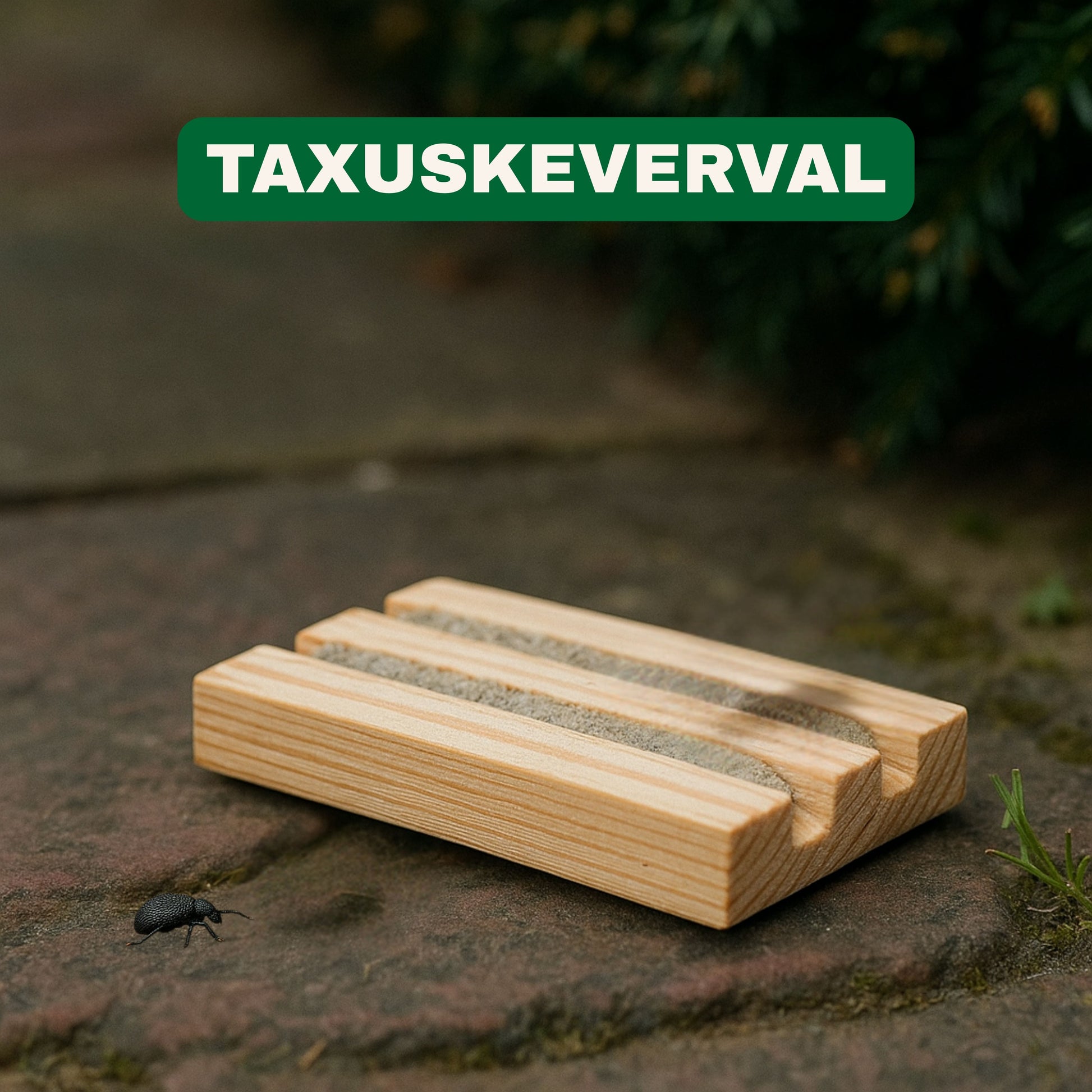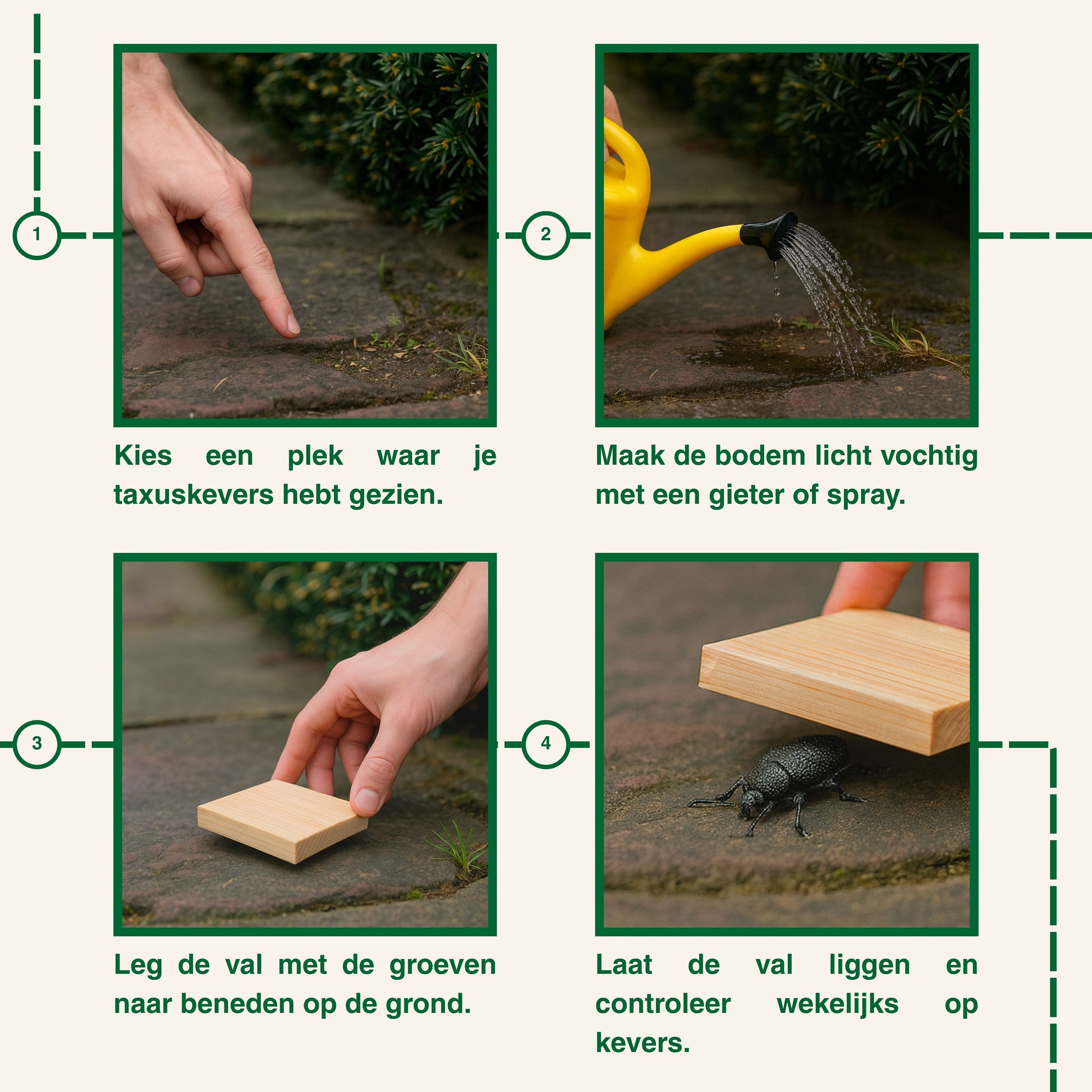 Een houten plankval met groeven gevuld met een gel waarin levende aaltjes (Steinernema carpocapsae) zitten. Volwassen kevers kruipen eronder om te schuilen en worden daar besmet. Ideaal voor gebruik bij taxus, hortensia, laurier, aardbeien, rododendron en andere planten waar de taxuskever dol op is.